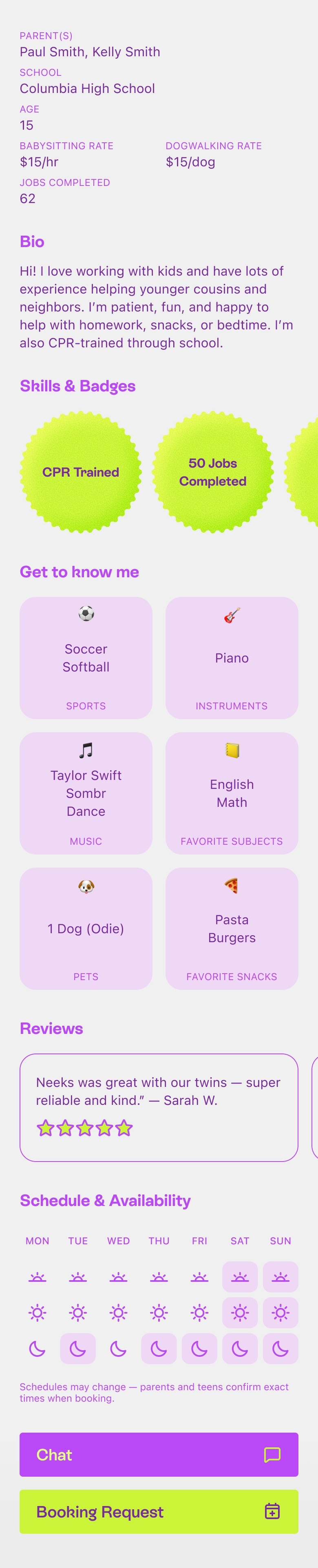 Browse parent-verified profiles and see how each teen connects to your community. Babysitting, tutoring, pet care, and more, all rooted in real relationships.